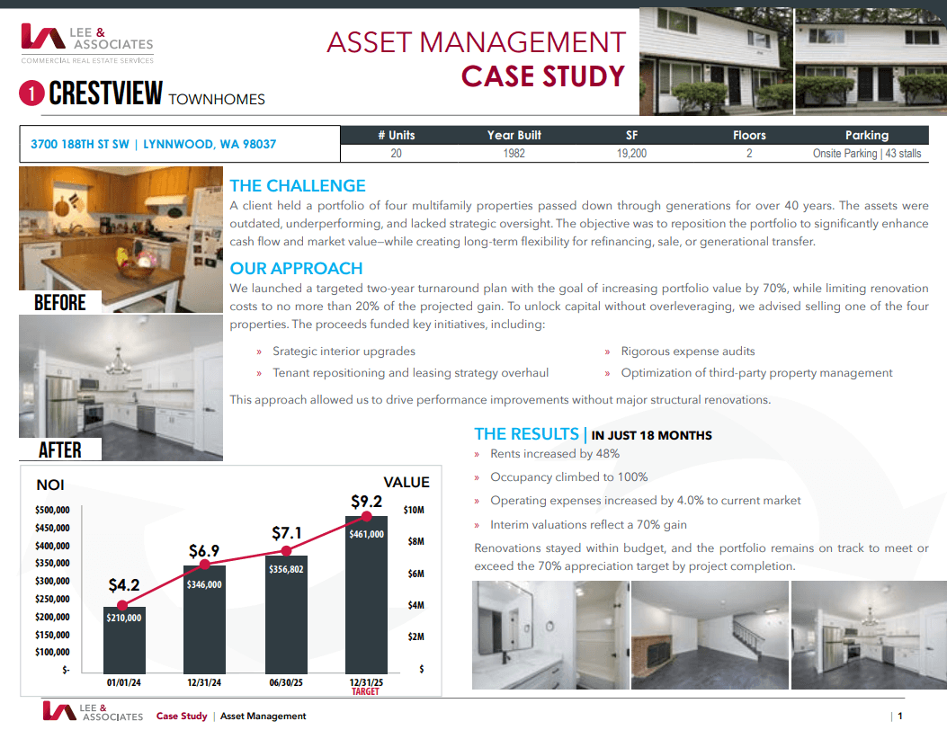 The Crestview Townhomes engagement reflects AGM’s core strength: delivering measurable results through disciplined execution. Rather than relying on heavy capital expenditures, our team focused on operational levers—smart renovation planning, expense control, and tenant-focused oversight—to drive real, bankable value.