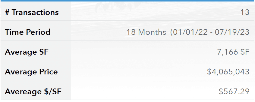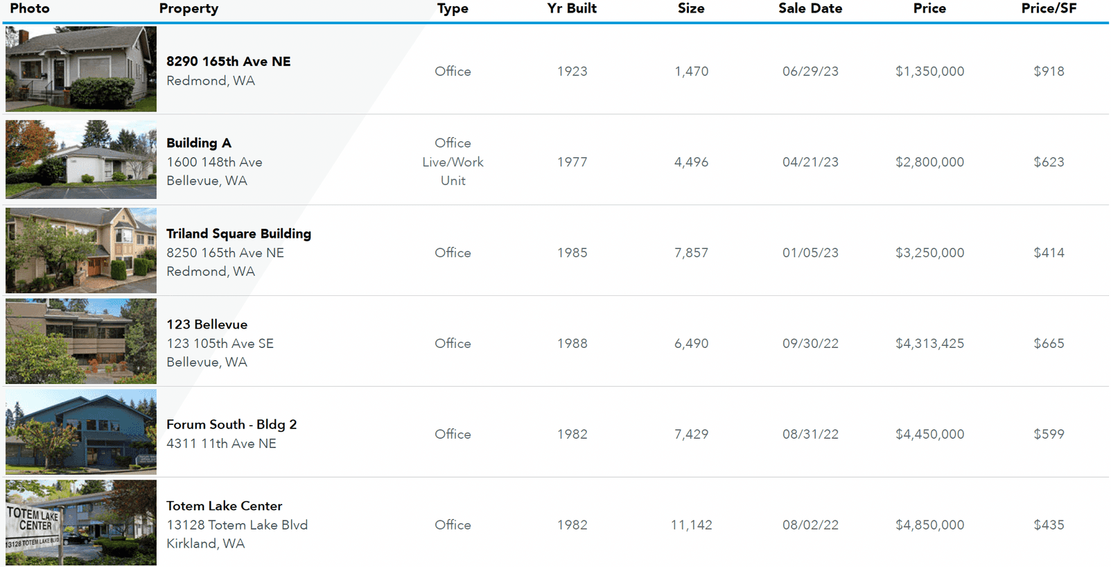 In our evaluation, 100% of the sales comparables were considered over the last 18 months for owner/user buildings located on the Eastside, which found an average sales price of $4,065,043, or $567.29/SF.