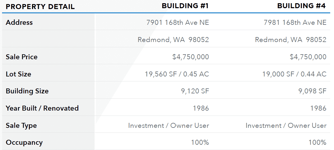Opportunity to acquire one or both of the buildings as an owner/user investment property in Central Redmond, with high value-add potential.